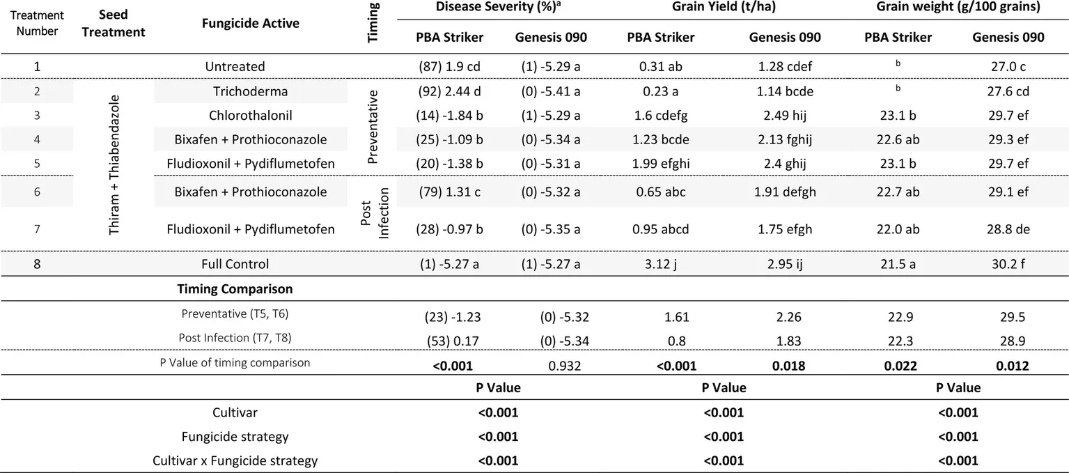A comparison of the post infection fungicide strategies (T7–T8) compared to the preventative fungicide strategies (T5–T6) highlighted a significantly higher disease severity during 2019 and in PBA Striker during 2020 at Horsham and during 2018 at Curyo (Tables 5, 6). However, it was significantly lower at Horsham during 2018 and Curyo in PBA Striker during 2019. Additional disease severity assessments at both sites also highlighted that the difference in disease severity between the post infection fungicide strategies (T7–T8), and the preventative fungicide strategies (T5–T6) were less in the cultivar Genesis 090 compared to PBA Striker (1Supplementary Data S1, 1S2). There was no difference between the Fluxapyroxad (T9) and Thiram + Thiabendazole (T8) seed treatments on disease severity with the post-infection fungicide strategy (Tables 5, 6).