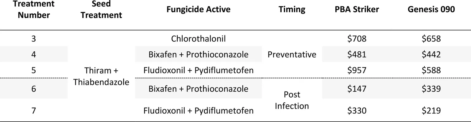 The gross margin results varied considerably between fungicide strategies and cultivars (Table 14). The highest gross margins were observed in the preventative timing (T4 and T5) compared to the post infection timing (T6 and T7; Table 14). The Chlorothalonil applied preventative (T3) also had higher gross margins than the dual actives applied post infection (T6 and T7). The highest gross margins were observed in the preventative applications of Fludioxonil + Pydiflumetofen (T5).