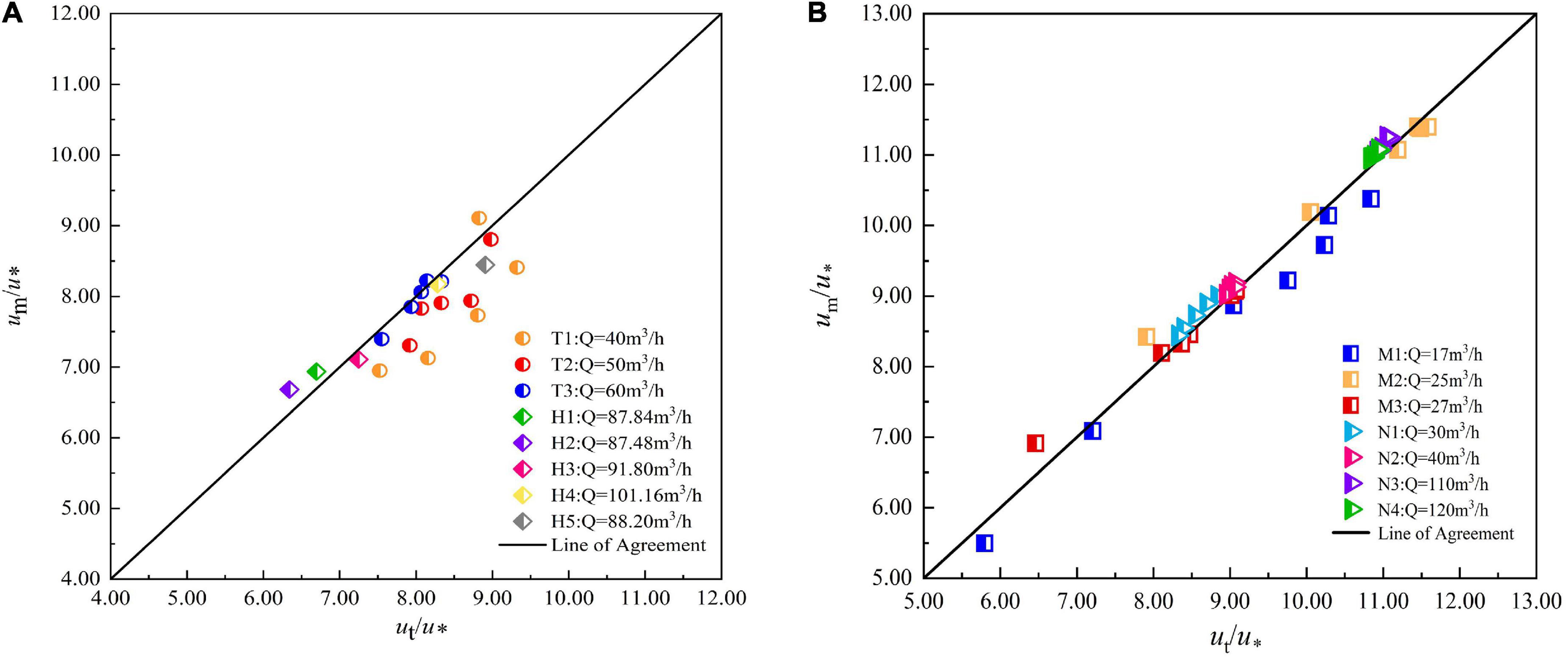 The measured flow velocity at the representative point of normal average flow velocity is taken as theoretical value ut, and the flow velocity obtained by averaging the flow velocities at all normal measuring points is taken as experimental value um, which is divided by to be dimensionless. The theoretical value (ut/)of the representative point is taken as abscissa and the experimental value (um/) is taken as ordinate and plotted in the coordinate system. It can be seen from Figure 8 that the flow velocity data of all working conditions are distributed near the straight line with slope 1.
