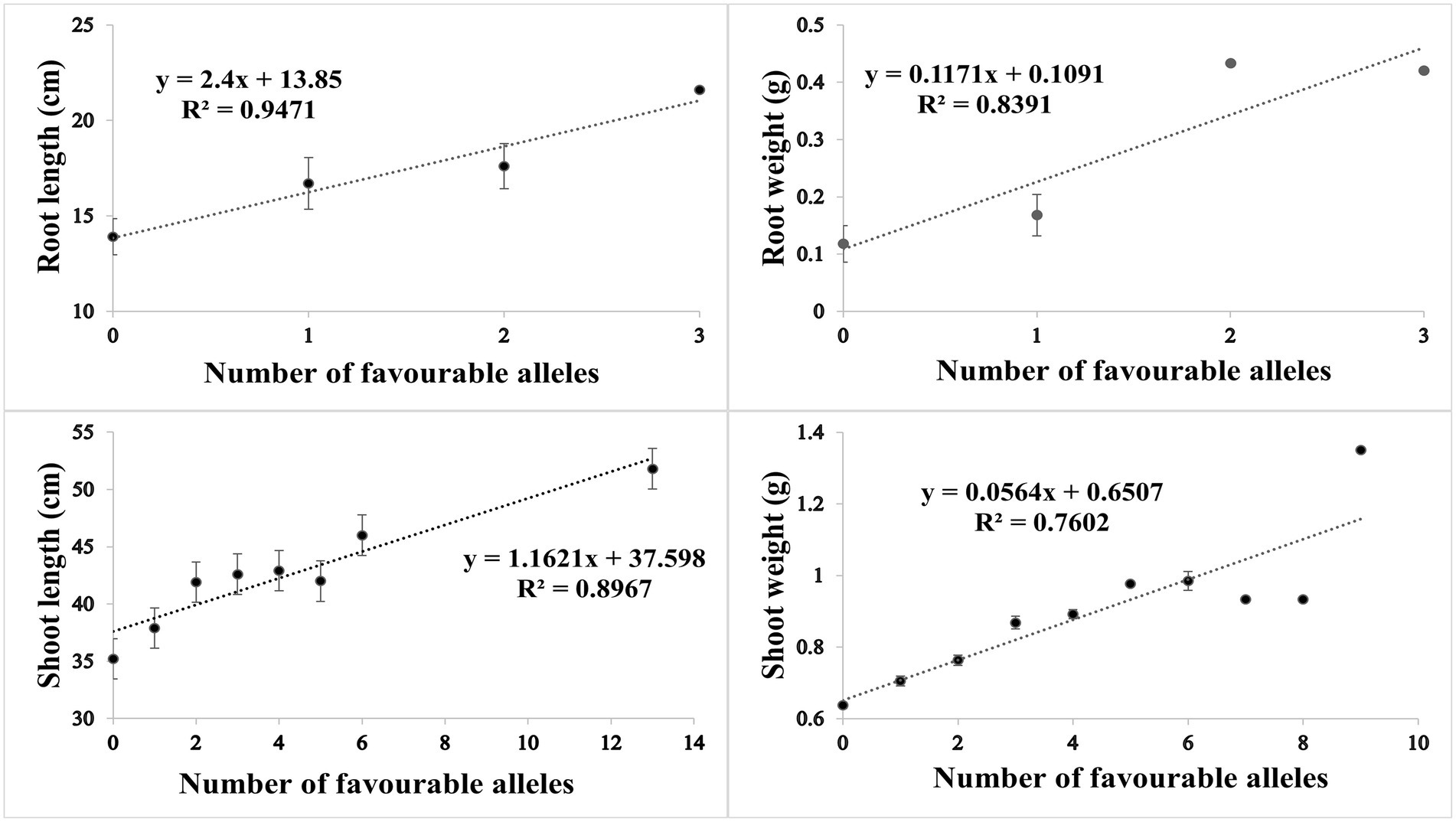 Figure 6. Scatter plots showing the effect of unfavorable alleles in (A) root length, (B) root weight, (C) shoot length and (D) shoot weight in HS.