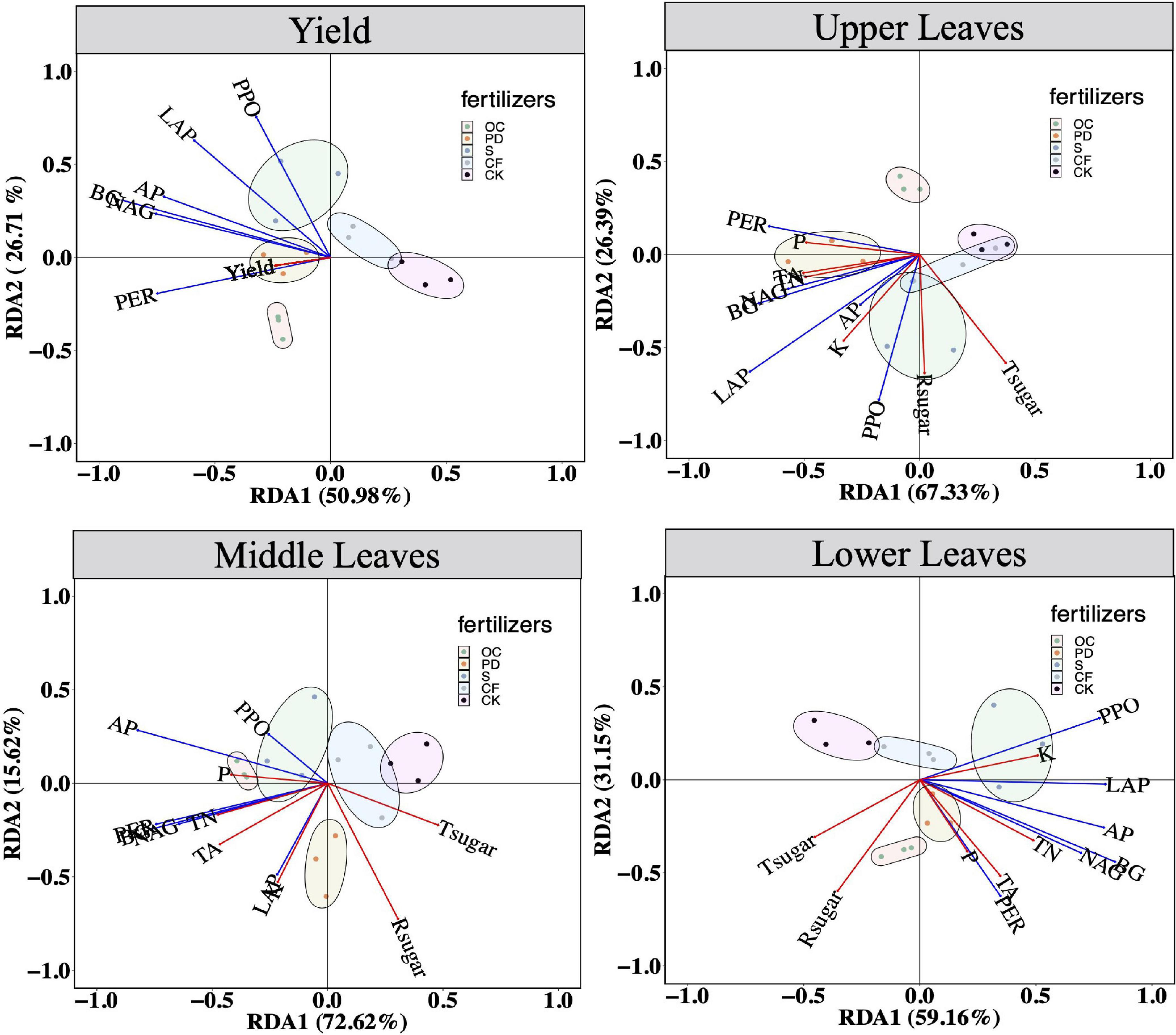 The relationships between the extracellular enzyme activity and the yield and qualities of tobacco leaves by RDA are shown in Figure 3. The first two axes of the RDA, RDA1, and RDA2, with 50.98 and 26.71%, explain rates of the variation in the relationship between yield and the extracellular enzyme activity. Organic fertilizer additions leads the tobacco yields are significantly differed from inorganic fertilizers and no fertilizers. The values of RDA1 and RDA2, or explain rates of the variation, are 67.33 and 26.39%, in the relationship between the qualities in upper leaves of tobacco and the extracellular enzyme activity, respectively. For the qualities in the middle leaves of tobacco and the extracellular enzyme activity, the explained rates of the variation are 72.62 and 15.62%, respectively. Those two values are 59.16 and 31.15% in the relationship between the qualities in the lower leaves of tobacco and the extracellular enzyme activity, respectively. In upper leaves, middle leaves, and lower leaves, the confidence ellipses of organic fertilizer addition are significantly separated from those in no fertilization. Briefly, yield and quality of tobacco leaves in upper, middle and lower positions, are all positively related to soil extracellular enzyme activity.