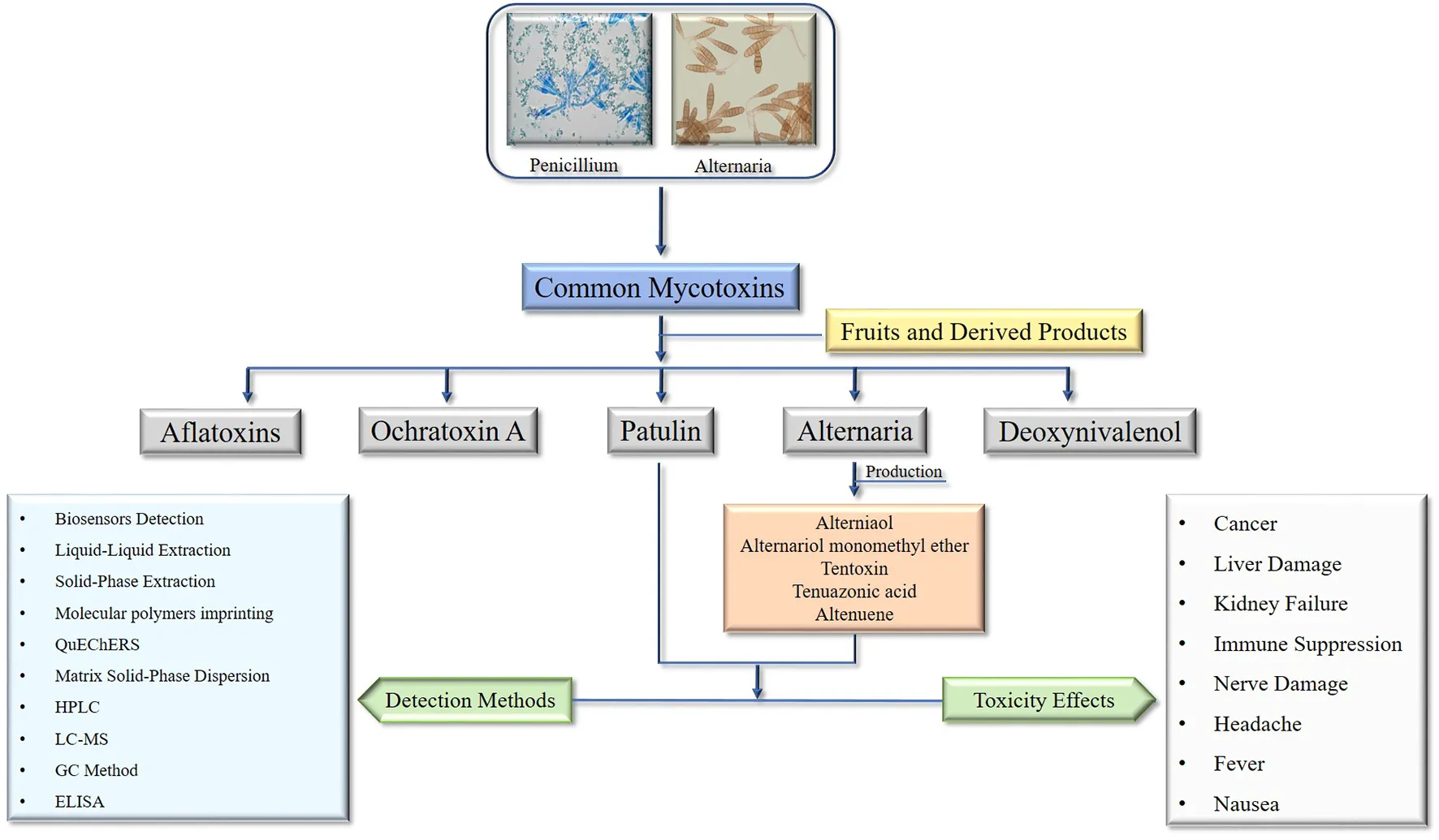 Alternaria and patulin, two types of more vivacious mycotoxins, can be found in fruits and fruit-derived products. These mycotoxins can be harmful to human health, and therefore their generation, accumulation, biosynthesis, and detection methods are of great interest to food safety researchers and practitioners (Mahakham et al., 2016). The generation and accumulation of Alternaria and patulin mycotoxins in fruits and fruit-derived products are influenced by various factors, such as temperature, humidity, storage conditions, and the presence of other microorganisms. For instance, high humidity and warm temperatures are conducive to the growth of Alternaria and Penicillium fungi, which can lead to increased mycotoxin production (Gutarowska et al., 2015). The biosynthesis of Alternaria mycotoxins involves various enzymes, including polyketide synthases (PKSs), non-ribosomal peptide synthetases (NRPSs), and cytochrome P450 monooxygenases (CYPs) (Villena et al., 2020). The biosynthesis of patulin involves a complex pathway that includes several enzymatic reactions. Various methods are available for the detection of Alternaria and patulin mycotoxins in fruits and fruit-derived products, including: High-performance liquid chromatography (HPLC) that separates and quantifies mycotoxins based on their chemical properties, enzyme-linked immunosorbent assay (ELISA) that bind to specific mycotoxins and the presence of mycotoxins in a sample can be detected using colorimetric or fluorescence methods, mass spectrometry (MS) to identify and quantify mycotoxins based on their mass-to-charge ratio, and Biosensors that use biological components to detect mycotoxins in food products to detect specific mycotoxins or a range of mycotoxins (Freire and Sant’Ana, 2018). Subsequently, Alternaria and patulin mycotoxins are a concern in fruits and fruit-derived products due to their potential harmful effects on human health. Researchers and practitioners use various methods to detect and quantify these mycotoxins in food products. Understanding the factors that influence their generation and accumulation can help mitigate the risk of mycotoxin contamination.