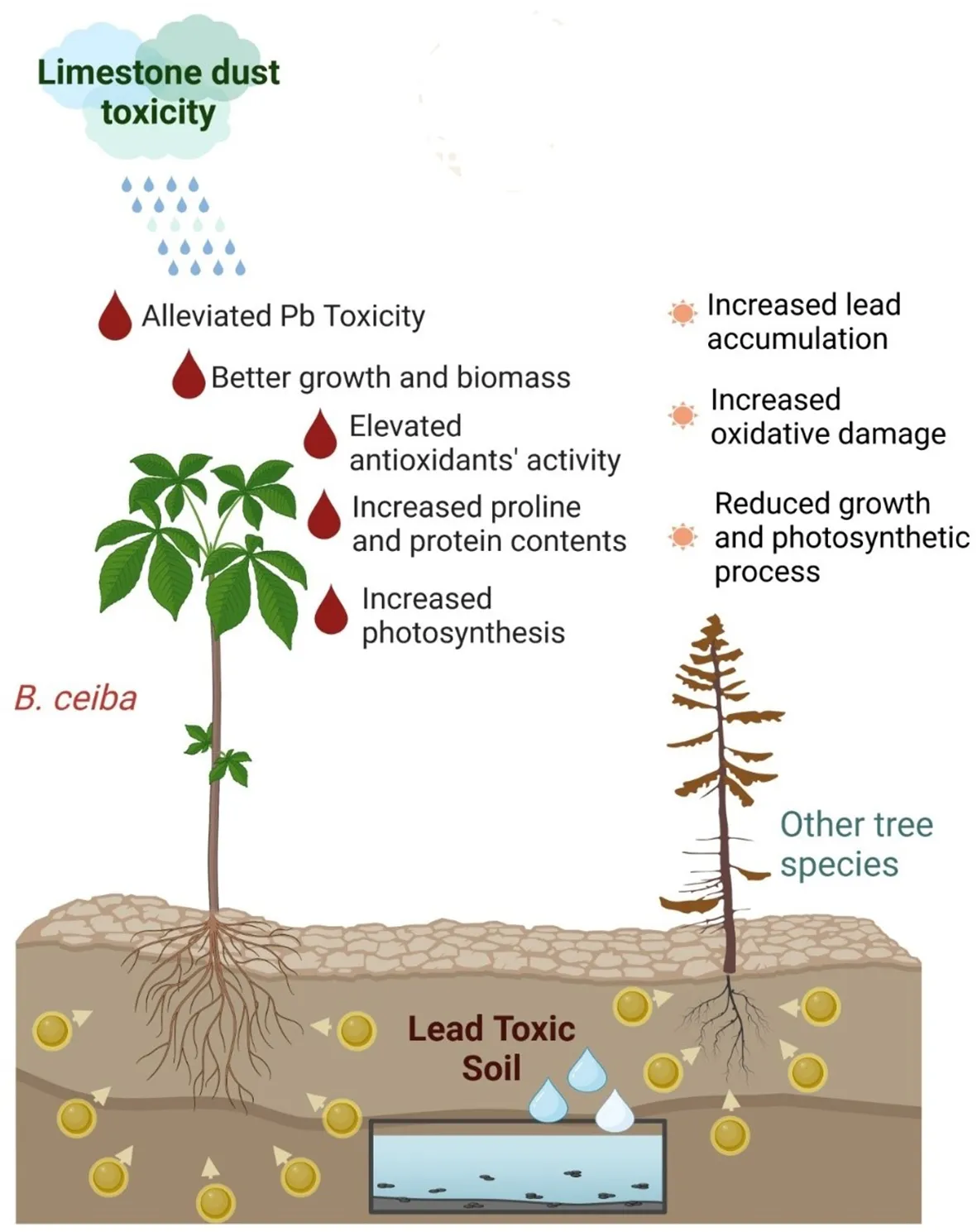 In previous studies, tree plant species have been used to alleviate Pb toxicities in the soil and environment (Ali et al., 2013; Satpathy and Reddy, 2013; Xiao et al., 2018; Wu et al., 2021; Yasin et al., 2021); however, there are various research gaps in selecting the most suitable tree species based on their physiological responses against atmospheric and soil pollution. The hypothesis of this study is that exposure to limestone dust and lead pollution will negatively impact the ecophysiology of urban tree species. Because limestone dust and lead are the most common urban hazards in the country, the present study was therefore conducted to evaluate the phytoremediation potential of the most commonly existing urban tree species, i.e., B. ceiba, E. camaldulensis, and C. lancifolius, based on their physiological and biochemical responses under different levels of Pb and lime dust toxicities.