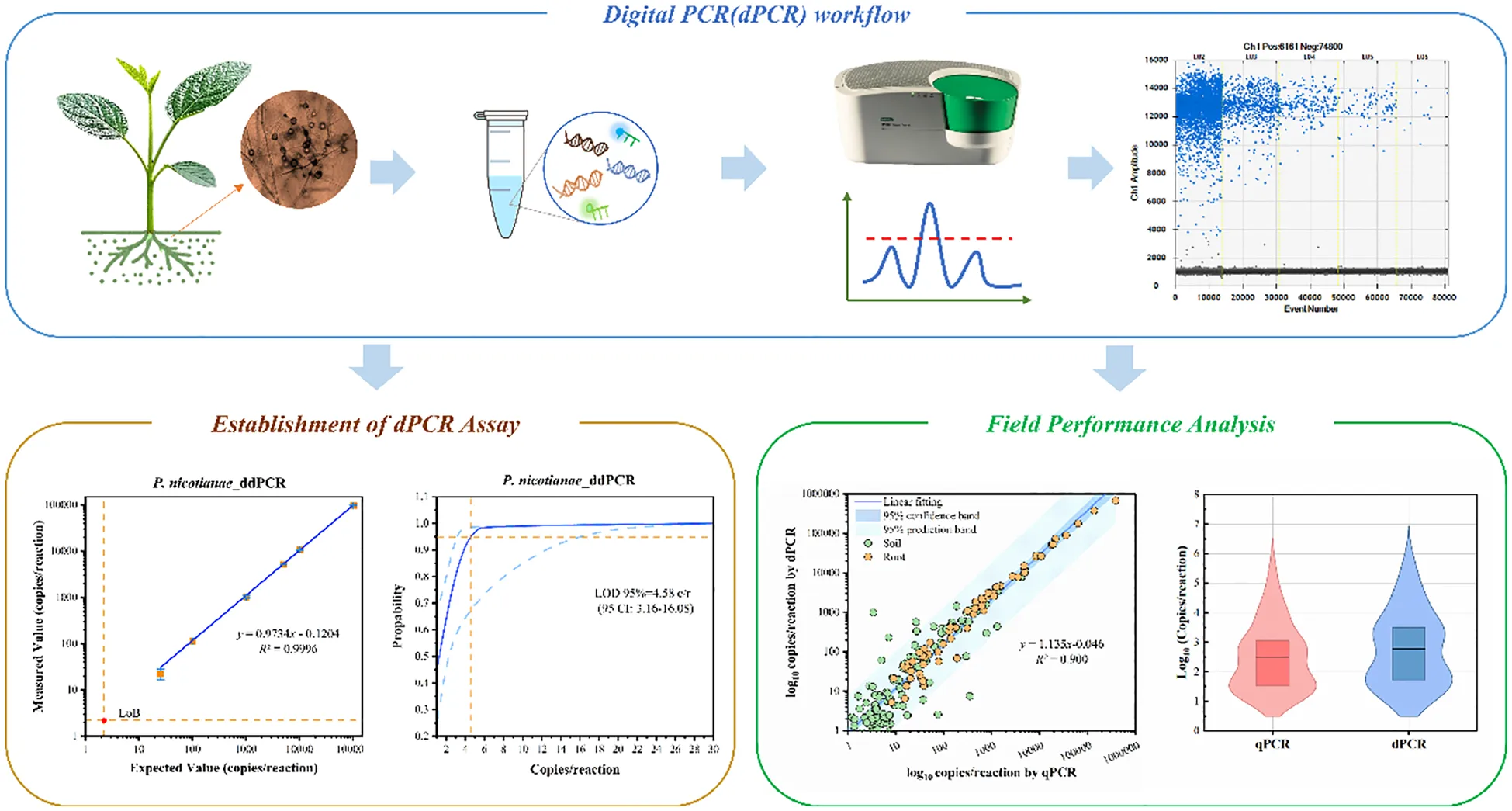 In this study, we developed a droplet digital PCR (ddPCR) method for detecting P. nicotianae and evaluated its analytical performance. We further compared ddPCR and qPCR using 213 field-collected samples, analyzed diagnostic performance through ROC curves to validate sensitivity and diagnostic accuracy. Additionally, pathogen loads were quantified and compared between the two methods.