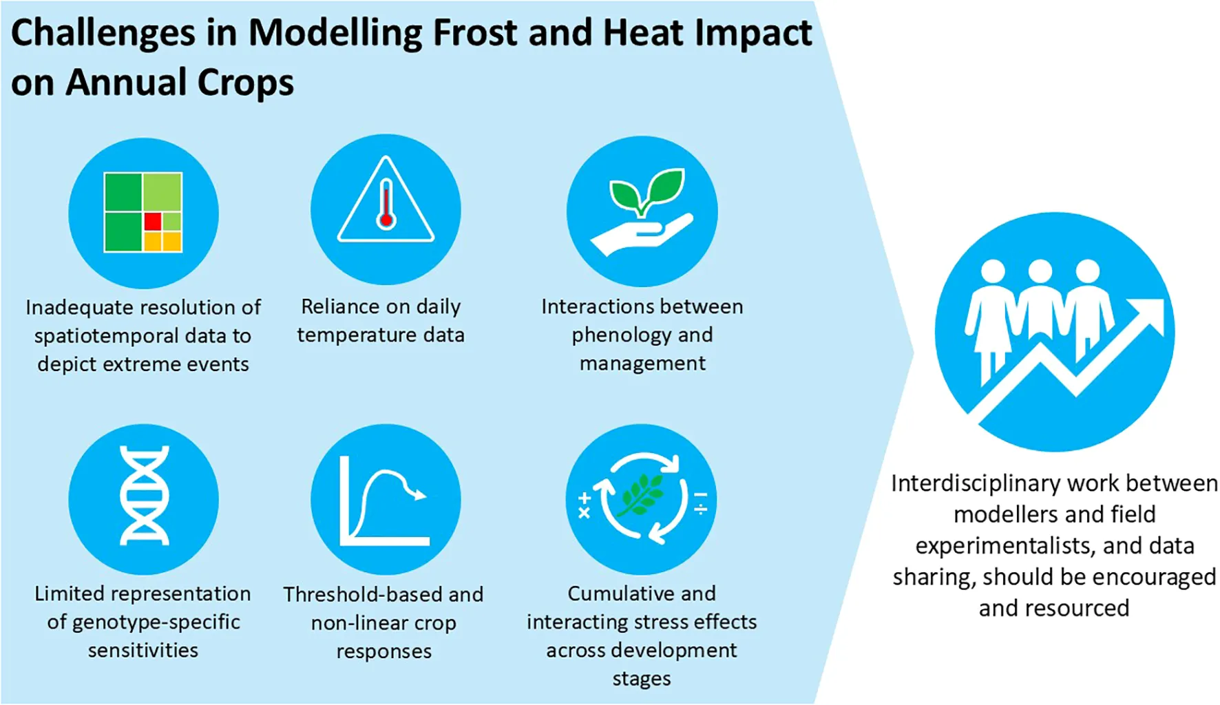 Current process-based modelling approaches face six major challenges: (1) insufficient spatial and temporal resolution for extreme events, (2) non-linear and threshold-based crop responses, (3) complex interactions between phenology and management, (4) cumulative and interacting stress effects throughout development stages, (5) inadequate representation of genotype-specific sensitivities, and (6) dependence on daily temperature data. Using sub-daily climate data, incorporating physiological damage mechanisms, and improving genotype-specific parameterisation will improve the modelling of frost and heat event impacts on the yield of cool-season annual grain crops. To achieve this, more interdisciplinary work between modellers and field experimentalists and data sharing should be encouraged and resourced.