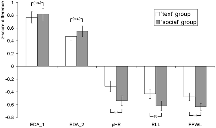 Figure 2. Differential responses (z-scores) to probe vs. irrelevant items: for the text and the social group, standardized response differences are depicted for first electrodermal reaction (EDA_1), second electrodermal reaction (EDA_2), phasic heart rate (pHR), respiration line length (RLL), and finger pulse waveform length (FPWL). Error bars represent the SEM; *indicate the level of significance of the group difference (text vs. social group; “n.s.”: not significant; *p < 0.05).