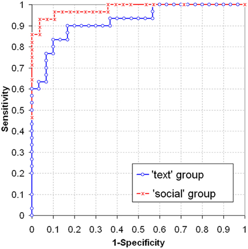 Figure 4 shows the ROC curves for the text group and the social group with the optimal-weight combination of the four physiological measures after shrinkage-correction.