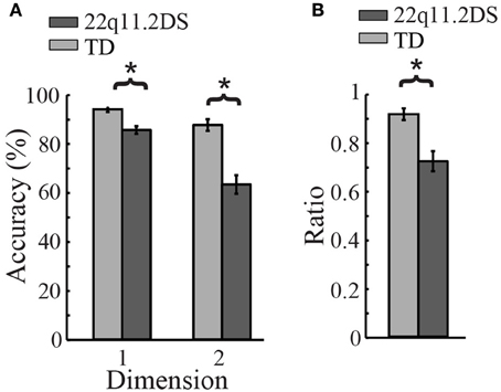 Figure 4. Results of Visually-Cued Card Sort (VCCS), a test of cognitive flexibility. (A) TD children had better accuracy when sorting by both dimensions (predominant and secondary, *p < 0.05). (B) Children with 22q11.2DS performed significantly worse when sorting by the secondary dimension relative to the predominant dimension, as indicated by this group difference in the ratio score of accuracy on Dimension 2 divided by that of Dimension 1 (*p < 0.05).