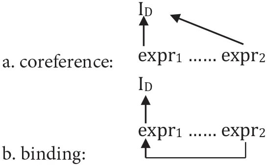 In summary, these contrasts show that two different modes of interpretation must be distinguished: (1) (shallow), directly assigning two (or more) expressions the same discourse entity from the interpretation domain (ID) as a value: co-reference as in (15a), and (2) (deep), interpreting one of the expressions first via another expression by grammatical—more specifically, semantic—means, as in (15b): binding6.