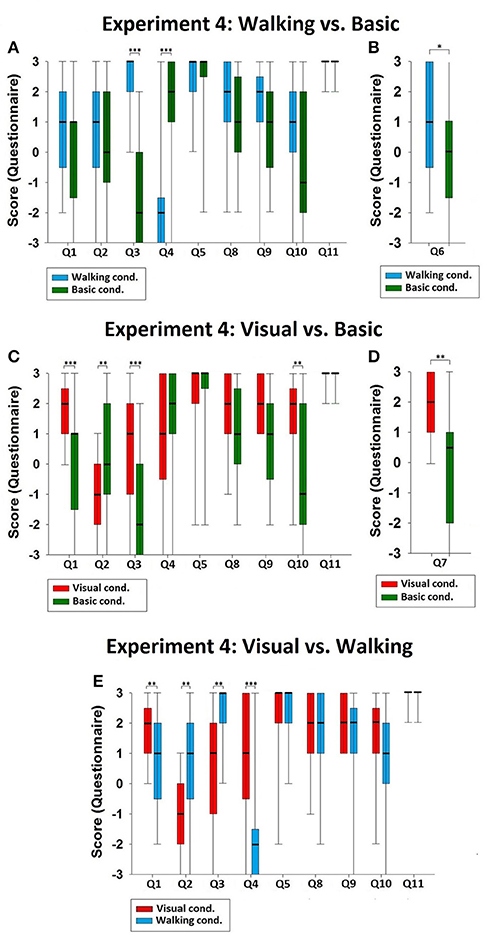 Figure 5. Comparisons of Experiment 4. (A) Comparison of the Walking and Basic conditions. The data values of Q3 and Q4 were significantly different, indicating the change in the sense of body-location in the Walking condition. (B) Comparison of the Walking and Basic conditions for Q6. The significant difference for Q6 indicated the discrepancy between the sense of body-location and the sense of 1PP-location in the Walking condition. (C) Comparison of the Visual and Basic conditions. The significant differences in Q1, Q2, Q3, and Q10 indicated that in the Visual condition there was change in the sense of 1PP-location and the sense of body-location, and that the double-body effect was induced. (D) Comparison of the Visual and Basic conditions for Q7. The significant difference for Q7 indicated the discrepancy between 1PP-location and body-location in the Visual condition. (E) Comparison of the Visual and Walking conditions. There were significant differences in 1PP-location (Q1 and Q2), and body-location (Q3 and Q4), indicating that the senses of 1PP-location and body-location were distinct between the Visual and the Walking conditions. Significance levels: *p ≤ 0.05; **p ≤ 0.01; and ***p ≤ 0.001.