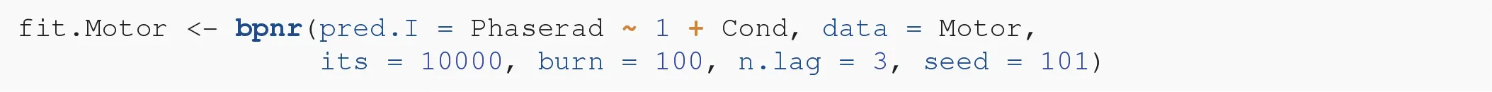 In this section we will fit a circular ANOVA model to the motor resonance data using the PN circular GLM from the package bpnreg. Note that the model from this package is in fact a regression model that we can speficy in such a way that it is mathematically equivalent to an ANOVA. First we will give the details on this model and subsequently we will discuss and interpret the results.