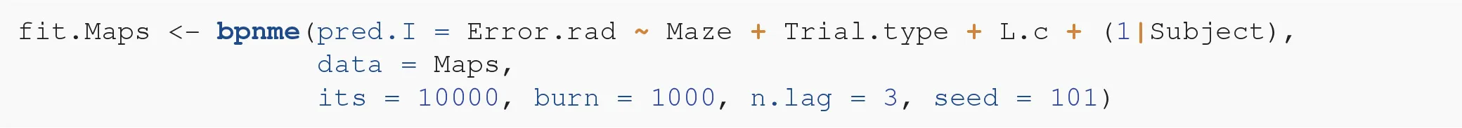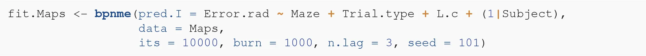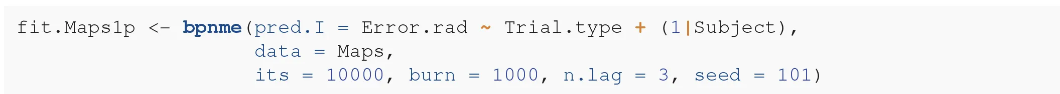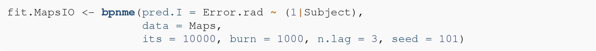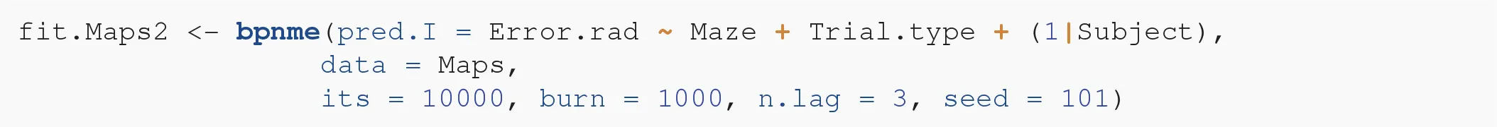 We use the package bpnreg to fit the model. Because this is a Bayesian method we have to specify some parameters for the Markov Chain Monte Carlo (MCMC) sampler that estimates the parameters of the model. MCMC methods are iterative and we thus need to specify the number of iterations that we want to run. We choose a relatively high number of the output iterations (its = 10000) to make sure that the sampler converges and that we don't need to run it again in case it did not. We choose the burn-in period to consist of 100 iterations (burn = 100). This means that we throw away the first 100 iterations to make sure that the iterations we keep are those at which the sampler has reached its equilibrium. We also choose the lag, that is how many iterations we want to keep, in this case every third iteration (n.lag = 3). We set a lag to prevent possible auto-correlation between the parameter estimates. In the next section we will elaborate further on how to check convergence and choose these MCMC parameters wisely. But first, we fit the model: