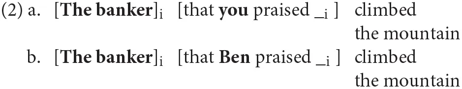 When pronouns are processed in the subject position within the relative clause, as in (2).a, self-paced reading experiments show that the critical verbal regions (“praised” and “climbed”) are read faster than when proper names are present, (2).b; when definite descriptions occupy both the head and the subject position, we obtain the slowest performance on the same critical verbal regions, as in (1)3.