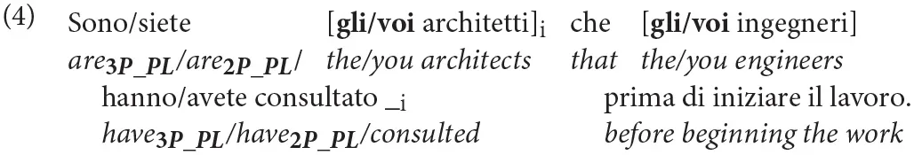 In this paper, we present a manipulation of person features [3rd (default) vs. 2nd person] in the paradigm in (3) to investigate the role of person agreement in Italian (an overt subject-verb person agreement language) under the presence of a “lexical restriction” (i.e., the NP introduced by the determiner): second person pronouns will be used as determiners and compared to definite articles under the presence of a plural lexical restriction, as exemplified in (4):