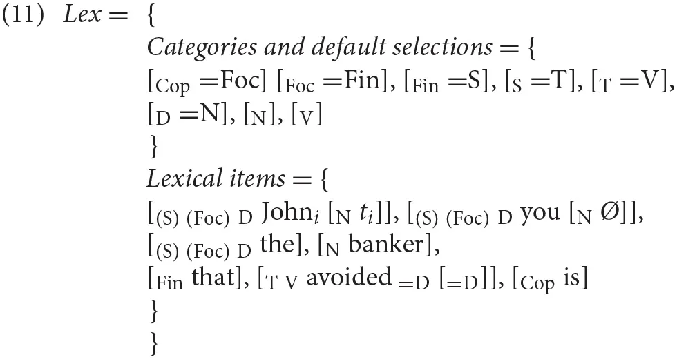 An alternative way to look at processing, without assuming any specific parsing algorithm or declarative grammatical rule format (as in Lewis and Vasishth, 2005), while maintaining an incremental left-right perspective, is presented in Chesi (2015, 2017): in the Minimalist top-down derivation proposed, merge is the sole structure building operation and it operates by attaching new (incoming) items always to the right of the phrase structure built so far (c.f. Phillips', 1996, merge right). The integration of new items is guided by the expectations triggered by the select feature(s) lexically encoded in the items already merged: for instance, a lexical entry like [V run = D]9 indicates that the verb (“V”) “run” selects a determiner (“=D”), namely that a DP is expected next; expectations are always projected after the lexical item is processed. If a category [X ] is expected (as result of the expansion of “=X” select feature) either a new [Xitem] or [XYitem] can be merged next; in the second case, [Y <item>] must be stored in memory since the “Y” categorial feature was unexpected (i.e., unselected) and must be remerged in the structure as soon as a lexical item with a “=Y” select feature is processed. This is how a non-local, filler-gap dependency (movement) is implemented. In (11), we exemplify the OC derivation using the grammatical knowledge (Lex) for the relevant paradigm in (9)10:
