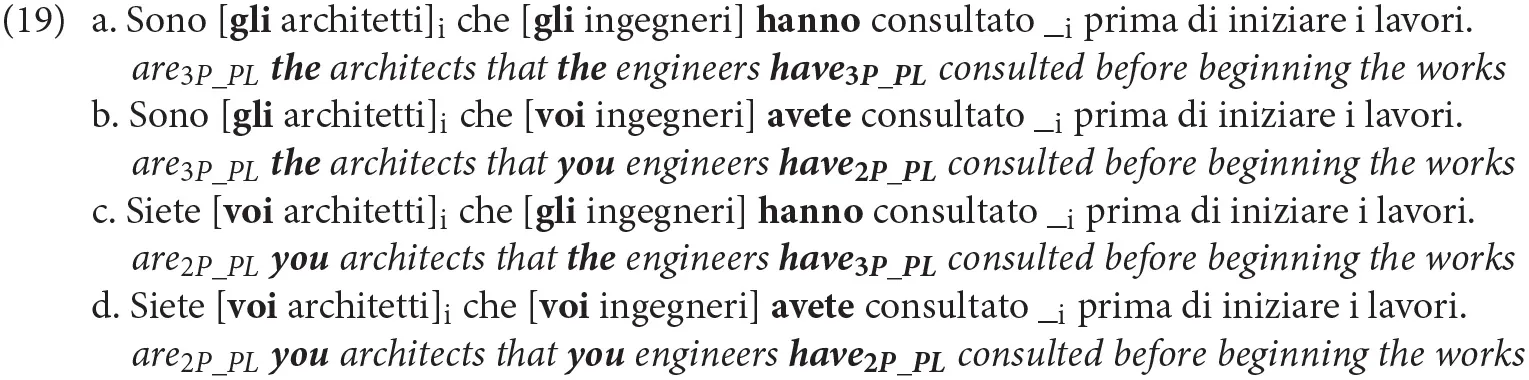 Warren and Gibson (2005) evidence [average reading times reported in (10)5], based on the paradigm in (9), shows that the greatest slowdown in self-paced reading at the critical verbal segment (avoided) is associated to the D2 condition [i.e., when the subject of the cleft is a definite description, (9).a,b,c]. This correlates with the lowest accuracy rate in comprehension questions. Similar (non-significantly different) reading times are revealed for the N1-N2 matching condition (9).b′, while the P1-P2 matching condition (always presenting a person mismatch), as well as the other conditions in which P is the subject of the cleft, produce the fastest reading times of the critical verbal region.