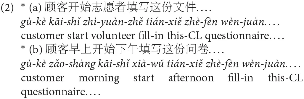 The event-selecting verbs in this study are five aspectual verbs: 开始 kāi-shǐ “begin/start”, 继续 jì-xù “continue”, 完成 wán-chéng “finish”, 结束 jié-shù “end”, 停止 tíng-zhǐ “stop”. They were selected based on linguistic diagnostics for raising verbs. According to Rochette (1999), all usages of aspectual verbs can be considered as raising predicates which do not impose selectional restrictions on their surface subject; the subject is restricted by the embedded predicate instead. In the coercion sentence顾客开始这份问卷 gù-kè kāi-shǐ zhè-fèn wèn-juàn “The customer started the questionnaire”, the surface subject 顾客 gù-kè “customer” can be also interpreted as the subject of the implicit predicate, e.g., 填写 tián-xiě “fill in”, such that the sentence has the meaning like “it is the customer who filled in the questionnaire”, but not “it is someone else who filled in the questionnaire”. This can be exemplified in (2a) in which the other participant “the volunteer” is involved, but the sentence is ungrammatical. Further, aspectual verbs do not introduce an independent event; rather, they function as “aspectual modifiers” which modify the event expressed by the embedded predicate and its argument (Rochette, 1999). The coercion sentence does not involve two events described by start and filling in the questionnaire but rather introduces only one single event of start to fill in. This can be tested in sentences like (2b) in which two distinct time reference adverbials (i.e., 早上 zǎo-shàng “in the morning” and 下午xià-wǔ “in the afternoon”) are included, but the sentence is ungrammatical. All the five aspectual verbs have the similar usages (Cao, 1996), and thus selected as the target verbs for the present study.