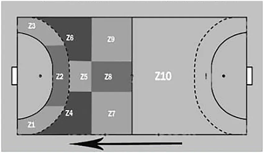| Zone | The shot zone of the offensive sequence | Z1 – Left wing attack Z2 – 6 mts – line player Z3 – Right Wing attack Z4 – Left back from 9 to 15 m Z5 – Centre Back from 9 to 15 m Z6 – Right back from 9 to 15 m Z7 – Left From 15 to 20 m Z8 – Centre From 15 to 20 m Z9 – Right from 15 to 20 m Z10 – Defensive area including GK area ![]() | Z1 Z2 Z3 Z4 Z5 Z6 Z7 Z8 Z9 Z10 |