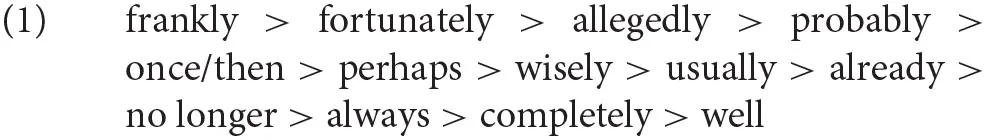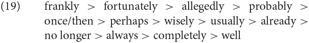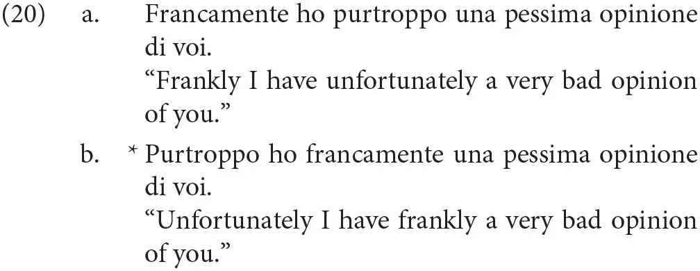 Although functional explanations of certain phenomena such as the crosslinguistic ordering of negative morphemes are both plausible and possible, this is much less likely to be the case with the ordering in (19). The ordering is too fine-grained to have risen from convergent cultural evolution, given that there is no apparent functional advantage to ordering adverbs in this way. For instance, consider the difference in ordering between frankly and fortunately in Italian, from Cinque (1999) below: