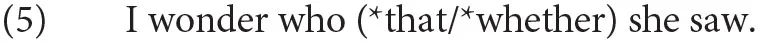 Let us start now with an introduction to the properties of the complementizer (C) domain in the CP-IP-VP conception of clauses in generative grammar. A complementizer is a word or morpheme that marks an embedded clause functioning as a complement—for example, a subject (Thatthe world is flat is false) or an object (Scientists believethatthere may be life on Venus). In both cases, the complementizer is that, which is the complementizer that is associated with finite clauses in English. However, there is reason to believe that the C domain has other properties, such as containing wh-words10. This is referred to the “doubly-filled COMP filter” in the generative literature, which excludes the complementizer that co-occurring with a wh-element. The fact that they are in complementary distribution indicates that they are related to each other, as seen in example (5)11: