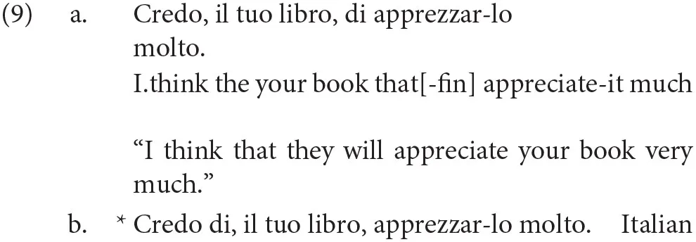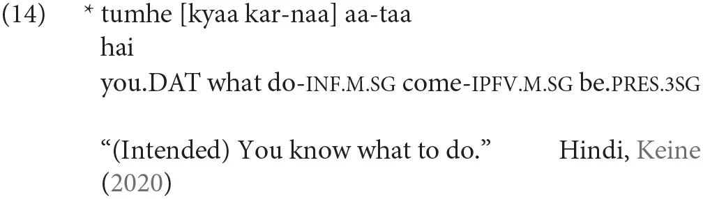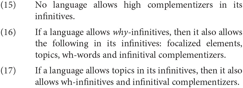 Here are some examples of how the generalizations in (15)–(17) work. For example, given that we mentioned previously that Italian infinitives allow topics, (17) predicts that Italian should allow have wh-words in infinitives. This prediction is borne out. The other languages that allow topics in infinitives, such as Hungarian, Hebrew, Russian, and Catalan, also allow wh-infinitives15.