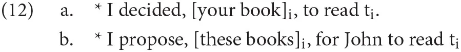 Adger (2007) notes a contrast between English and Italian infinitives; topics are not allowed at all in English infinitives, whether or not the nonfinite complementizer for is present. We previously saw that Italian infinitives allowed topics in example (9) above. In other words, Italian infinitives allow topics, while English infinitives never do.