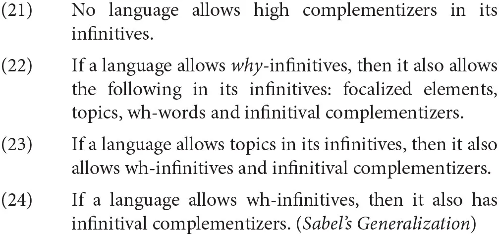 I extend Sabel's observation to several other properties of the infinitival left periphery and conduct a more rigorous crosslinguistic sample in Satık (2022), based on the aforementioned properties of the C domain such as the presence of topics. Based on a survey (presented in Table 1 below) of 26 languages belonging to many different language families, I conclude that the following crosslinguistic generalizations are true.