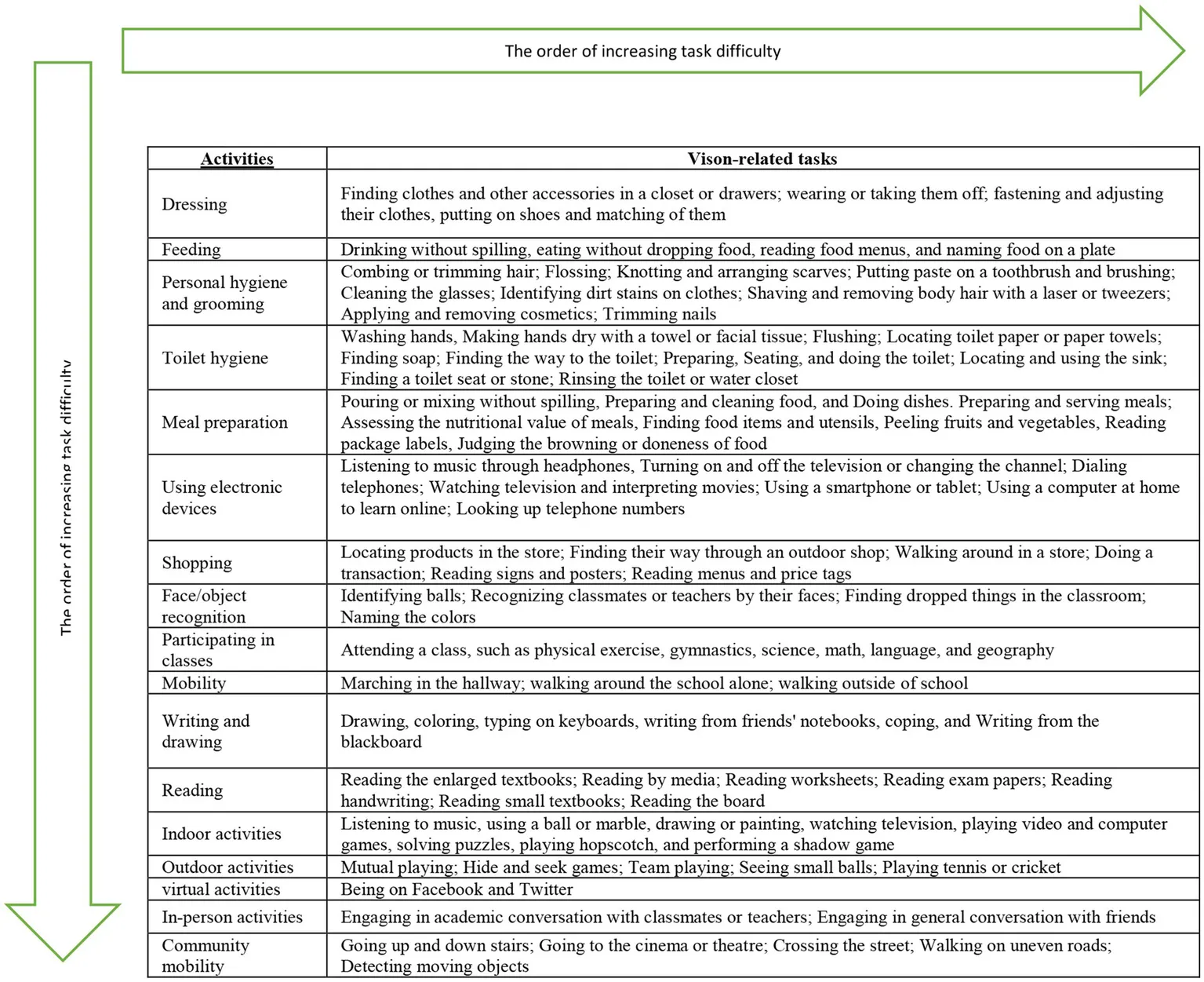 During the review phase, which included 22 studies, and the interview phase, which involved 16 participants, a total of 95 and 85 vision-related tasks were identified, respectively. These tasks were then categorized into 17 activities and five occupations, which included activities of daily living (ADL), instrumental activities of daily living (IADL), education, play, and participation in social activities. Among these occupations, ADL was the easiest, while participation in social activities was the most challenging. Finally, the tasks were arranged based on their difficulty level for children with visual impairment.