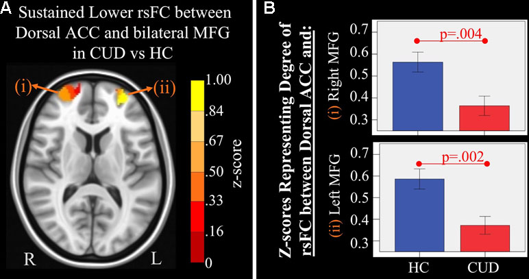 Figure 4 Main effect of group of dorsal anterior cingulate cortex (ACC) resting-state functional connectivity (rsFC) identified by a 2 × 2 mixed-model (group × time) analysis controlling for alcohol and nicotine. (A) LEFT: Axial Montreal Neurological Institute (MNI) brain slice (z = 11) illustrating clusters that showed a significant main effect of group in rsFC between the dorsal ACC seed and (i) right medial frontal gyrus (MFG; Brodmann area 10; 276 voxels) and (ii) left MFG (Brodmann area 10; 293 voxels). (B) RIGHT: Bar graphs representing mean (error bars: +/− 1 standard error) illustrating significant main effects characterized by lower rsFC between dorsal ACC and (i) right middle frontal gyrus (MFG) (F = 9.621, p = 0.004) and (ii) left MFG (F = 11.278, p = 0.002) in individuals with cannabis use disorder (CUD) than healthy controls (HC) across time.