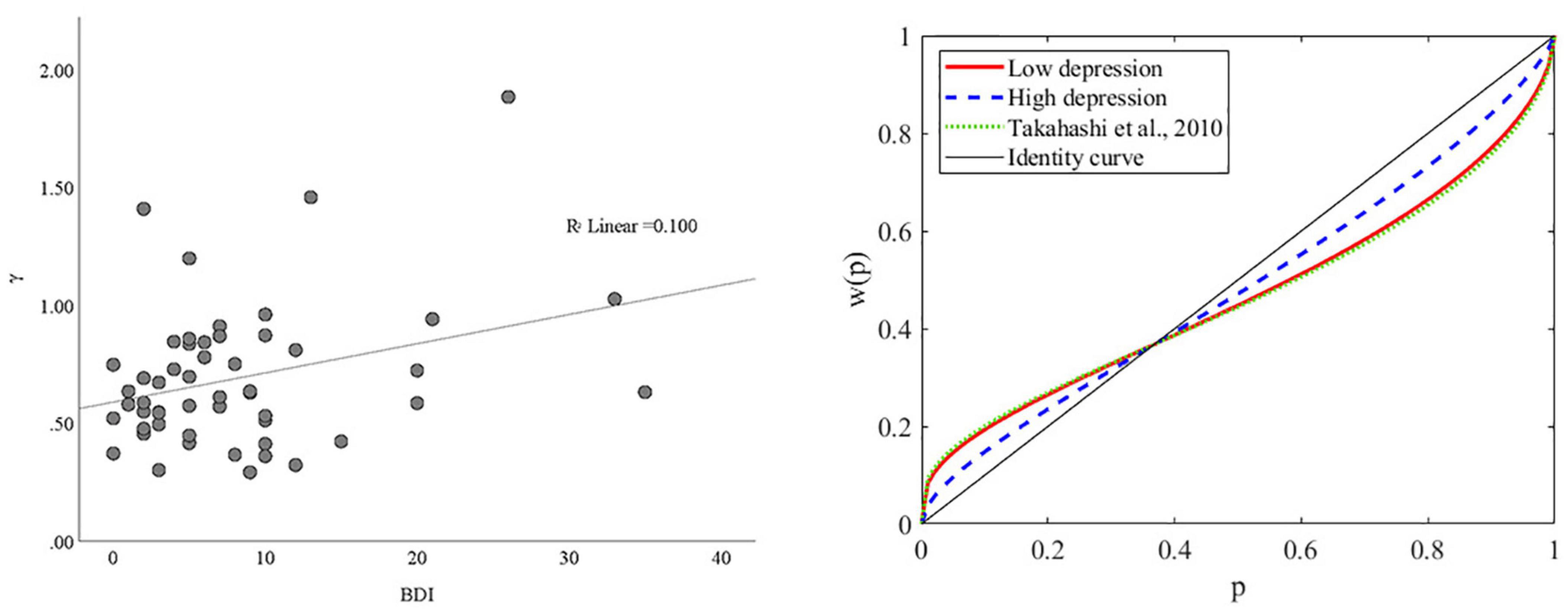 Figure 4. The association between BDI and γ. (Left panel) Scatterplot of the association between BDI and γ. (Right panel) Probability weighting function plots for subjects with high and low depression. The mean of γ for the low and high depression groups were 0.5964 and 0.7772, respectively. The mean of γ for a similar group of Japanese young adults was 0.57 in Takahashi et al. (29).