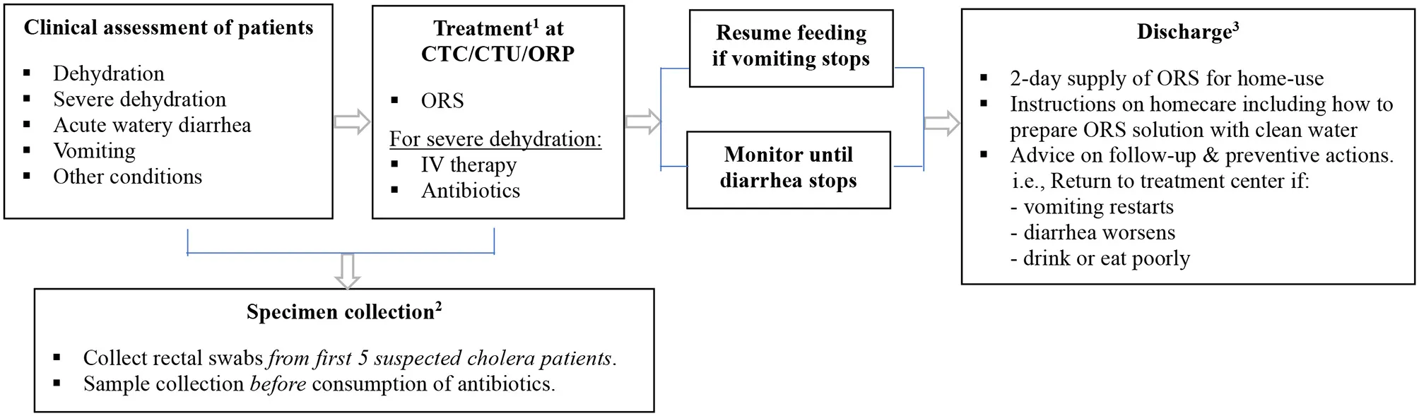 CT, Cholera Treatment Center; CTU, Cholera Treatment Unit; ORP, Oral Rehydration Points; ORS, Oral Rehydration Solutions; IV, Intravenous.