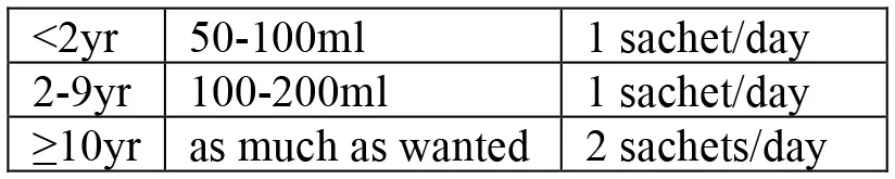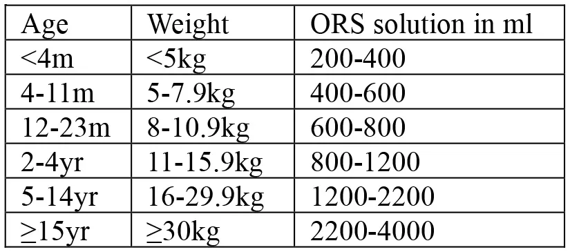 | • ORS after each loose stool to maintain hydration until diarrhea stops • If patient lives far from treatment center or correct home treatment can't be guaranteed: keep under observation • Sent home with a 2-day supply of ORS with instruction on preparing ORS solution with clean water and schedule: ![]() • Instruct patient to return to treatment center if condition deteriorates (if repeated vomiting, number of stools increased, patient drinks or eats poorly) • If patient starts vomiting or develops abdominal distension: Ringer's Lactate 50 ml/kg over 3 h, followed by ORS after assessment of hydration status (monitor every 4 h) | • Admit to treatment center • ORS and monitor until diarrhea/vomiting stops (if patient vomits, wait 10 min, and continue slowly) • Amount of ORS required in 4 h subject to patient's weight (75 ml/kg in 4 h). If patient's weight is unknown, use age ![]() • During first 2 h of treatment: monitor rehydration frequently (at least every hour) • After first 4 hours of treatment: if no more signs of dehydration, follow Treatment Plan A • After first 4 h of treatment: if still signs of moderate dehydration, repeat Treatment plan B for another 4 h and reassess • At any time during treatment: if patient's symptoms deteriorate (if signs of severe dehydration, confused or disorientated, frequent/severe vomiting), immediately shift to Treatment plan C • If patient can't drink and if IV therapy not feasible at treatment center: rehydrate patient using nasogastric tube | • Admit to treatment center • IV treatment immediately to restore normal hydration within 3–6 h: ![]() - Ringer's lactate as first choice of IV fluids - If Ringer's lactate not available, normal saline or 5% glucose in normal saline - Plain 5% glucose solution not recommended • If patient can drink, ORS 5 ml/kg/h can be also given simultaneouly with IV drip • If fluid can't be given through IV route, give ORS (20 ml/kg over 6 h) through a nasogastric tube • Assess patient's condition every 30 min during the first 2 h; then every h for next 6–12 h • Monitor pulse and respiratory rates, frequency of urine, stool, and vomiting- Regular urine output (every 3–4 h): good sign of enough fluid- Sign of increasing edema: evidence of over hydration- Sign of continued fast breathing and rapid pulse rate during rehydration: may be early signs of heart failure- Stop rehydration immediately if patient shows any of these signs • Antibiotics5 only to patients with severe dehydration to shorten duration of illness and carriage of pathogen | ||