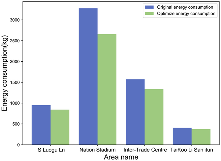 From the simulation results in Figure 14, it can be found that the energy consumption in the National Stadium area is highest (of the four areas) during the weekday evening peak hours. This is due to the traffic congestion caused by the excessive traffic demand on the N 4th Ring Road in the evening peak (17:00–19:00). After using the RSO strategy, vehicles flowing into the area from the surrounding area are controlled. The traffic flow in the area decreased and the driving speed increased. The overall energy consumption of road network traffic in the region fell by about 18.8%, the largest drop among the four regions. The second is the international trade area, where the overall energy consumption has dropped by about 15%. S Luogu Ln and Sanlitun area cities have few lanes in the built road network, the RSO strategy has limited improvement in the vehicle traffic capacity of the road network. The reduction in energy consumption decreased by about 11.7 and 7.5%, respectively. In the urban road network construction structure, the area with the greater traffic capacity, the more obvious the energy consumption reduction effect after using the RSO strategy.