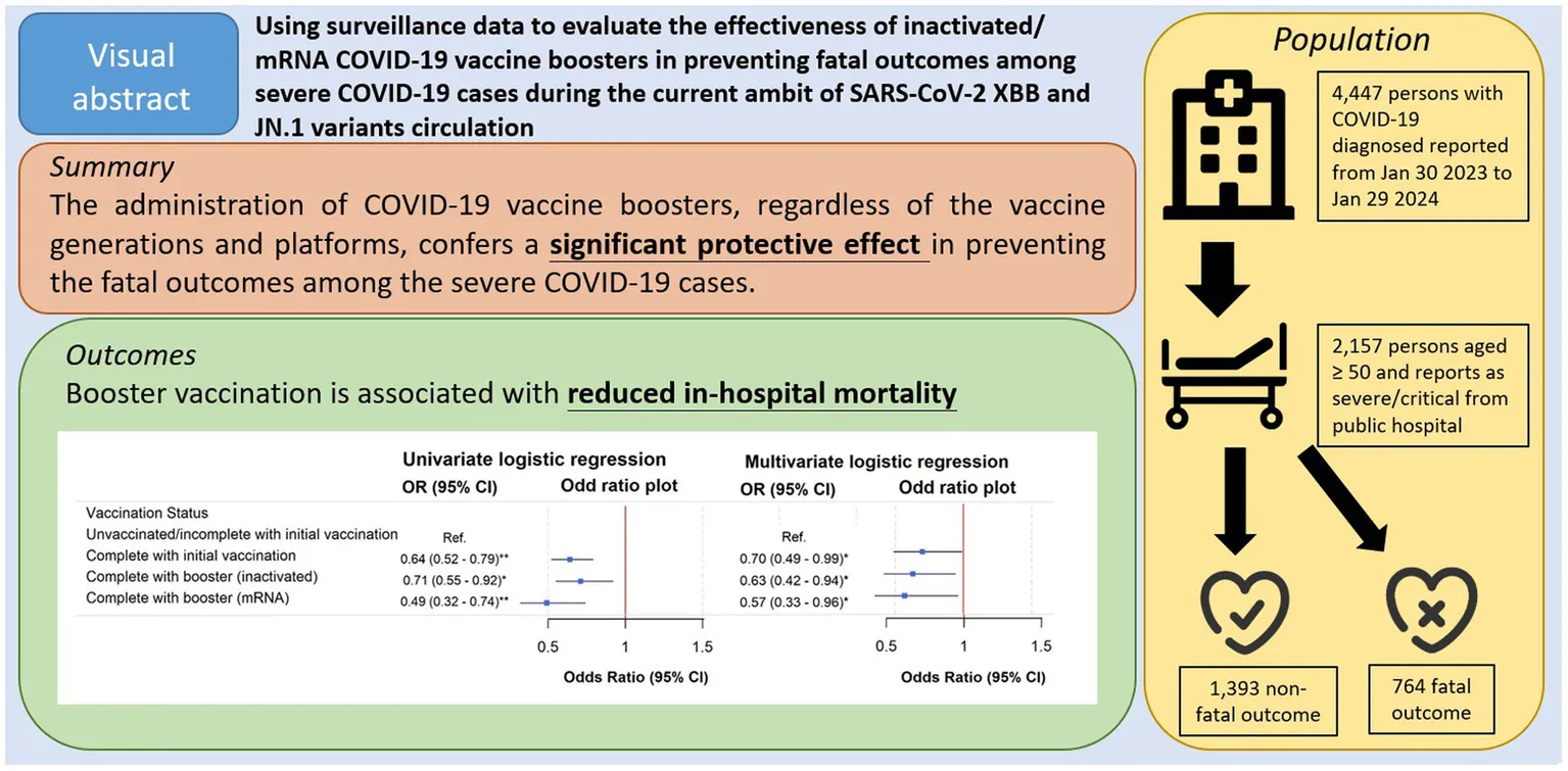 In conclusion, our findings demonstrated that the administration of COVID-19 vaccine boosters, regardless of the vaccine generations (ancestral or the newer bivalent for ancestral and BA.4/5) and platforms (inactivated or mRNA), confers a significant protective effect in preventing the fatal outcomes among the severe COVID-19 cases. The result aligns with the WHO’s endorsement of booster vaccines as a key measure in preventing the worst outcomes of COVID-19 (38). We supplement the information on the ancestral strains vaccine effectiveness under the current ambit of SARS-CoV-2 variant circulation.