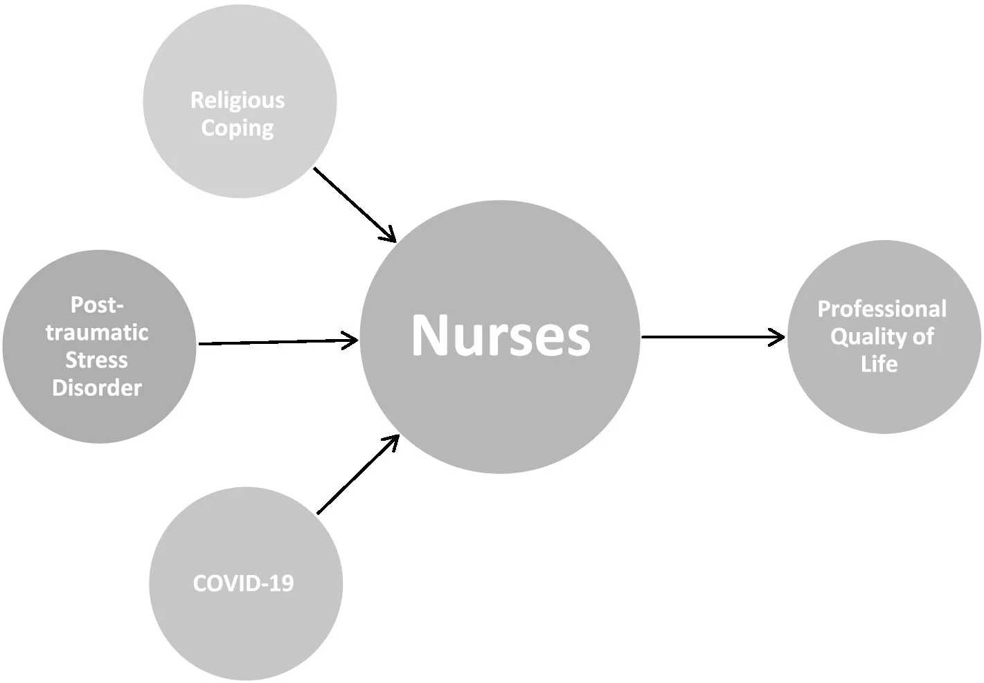 Theoretical model to determine Relationship between Religious Coping and Post-traumatic Stress Disorder and Professional Quality of Life of Nurses Working at COVID-19 Wards.