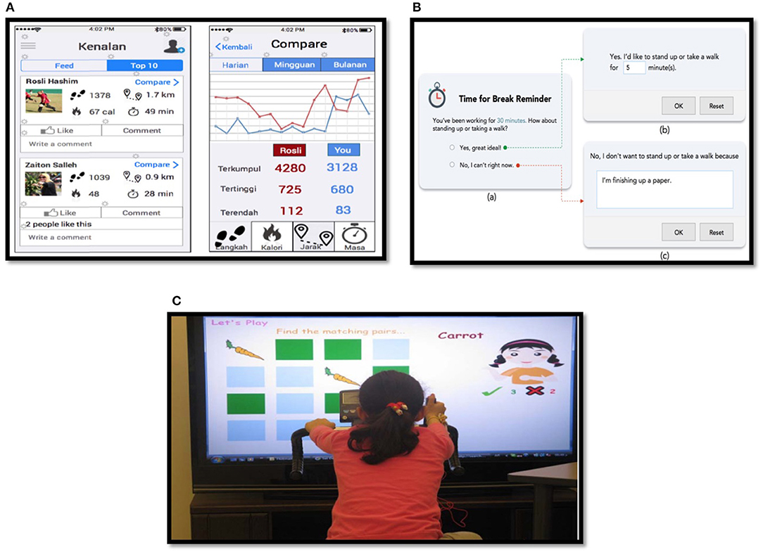 The reward strategy was exemplified as badges in the “BunnyBolt” game [102]. A virtual trophy or stars were used in the “Polar FT60” system as rewards [55]. Intelligent musical stairs known as “Social Stairs” were implemented as a reward strategy by triggering music corresponding to the user's steps on stairs [110]. As shown in Figure 7A, there were seven visual growth levels for the virtual fish in the “Fish in Steps” desktop game and a happy facial expression of virtual fish was used as reward and tracking/self-monitoring strategies for users [39].