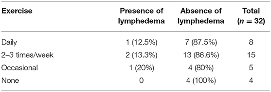 Table 5. Lymphedema incidence at 2 years according to the frequency of exercises in the experimental group.
