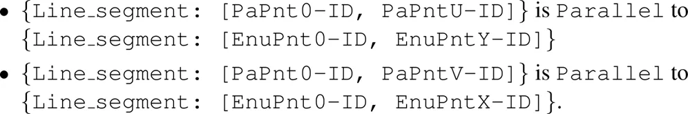 • Frame: it adds two metric constraints to the Simplex entity: 1) the length of each Line segment is the unity length, and 2) the Line segments are perpendicular (or orthogonal). The orientation of a Frame is typically an essential attribute, because of its use to represent coordinates.
