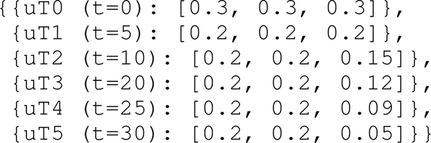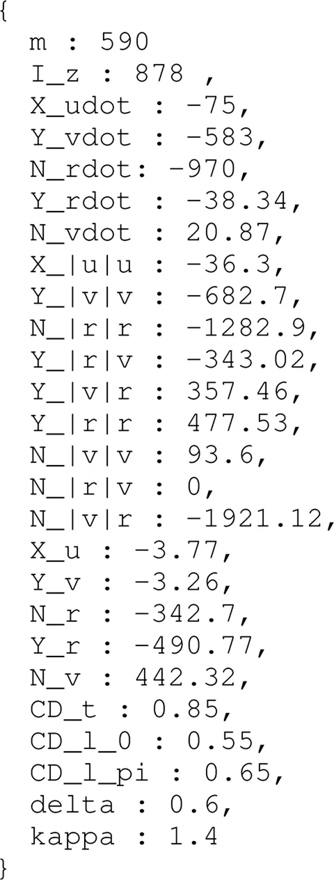 As mentioned in Section 3.1.3, the hydrodynamic model of the Cogge has threshold speed values (see Listing 11), which trigger the configuration of the damping matrices. For the higher velocity regime of the Cogge, meaning, , and , the value of the coefficients for MRB, CRB, MA, CA, DN, and DL can be found in the Listing 9. The diagonal terms (except N|v|r|v|) of these matrices are based on the , , and model structures, identified and discussed in Peeters et al., (2020c). The remaining off-diagonal terms were manually tuned with reference to a port and starboard side turning circle.