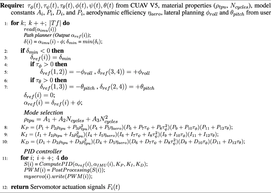 • Path planner: calculation of the desired arm deflections αref(i) = δref(i) + ϕ as a function of the flight condition. During hovering and yaw maneuvering, the ideal angle is δref(i) = 0, which means that the arms are parallel to the central body of the UAV ϕ (unless one of the arms has a smaller angle δmin = min (δi) < 0°, in which case that will be the reference deflection). During roll and pitch maneuvers, the desired inclination angles are selected (ϕroll, θpitch).