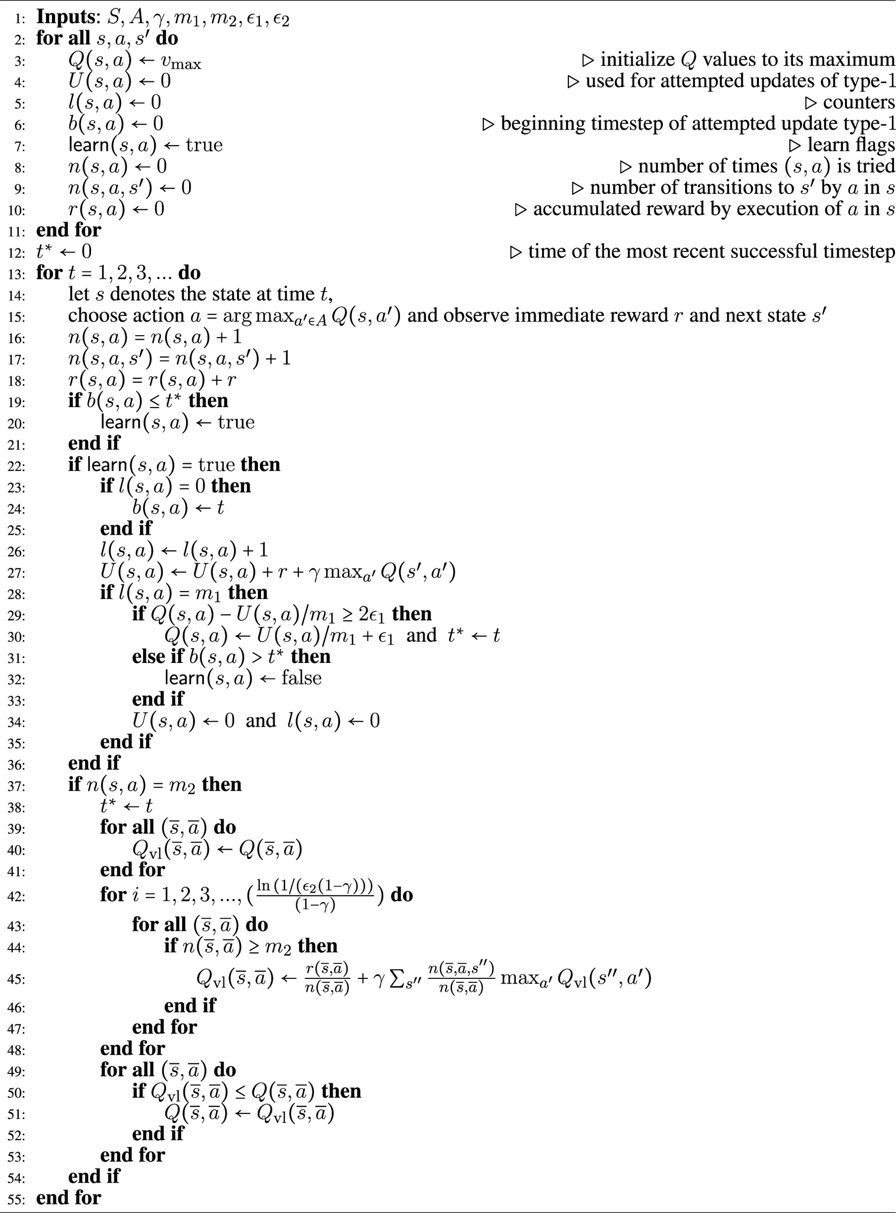 Algorithm 1 consists of four main sections: 1) In lines 1–12, the internal variables of the algorithm are initialized; 2) In lines 13–19, an action is greedily selected in the current state and the consequent immediate reward and new state are observed and recorded; 3) The model-free part of the algorithm is presented in lines 20–37 that resembles the Delayed Q-learning algorithm (Strehl et al., 2006); 4) Lines 38–56 represent the model-based part of the algorithm that is similar to R-max algorithm (Brafman and Tennenholtz, 2002) with a modified update mechanism which is needed for preserving the PAC property of the overall hybrid algorithm.