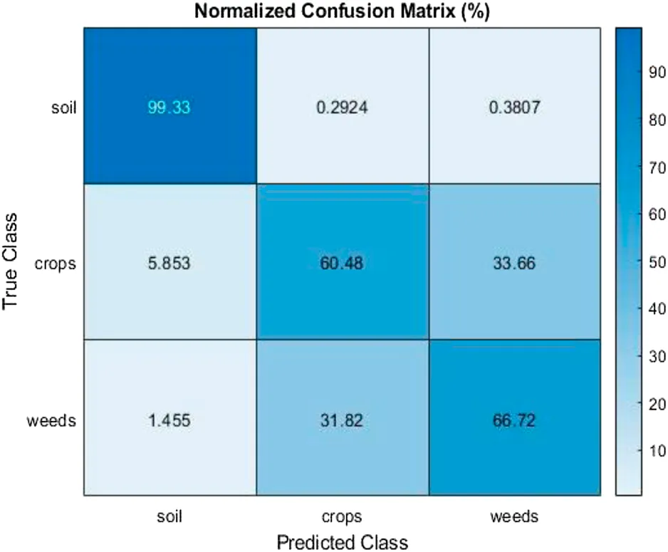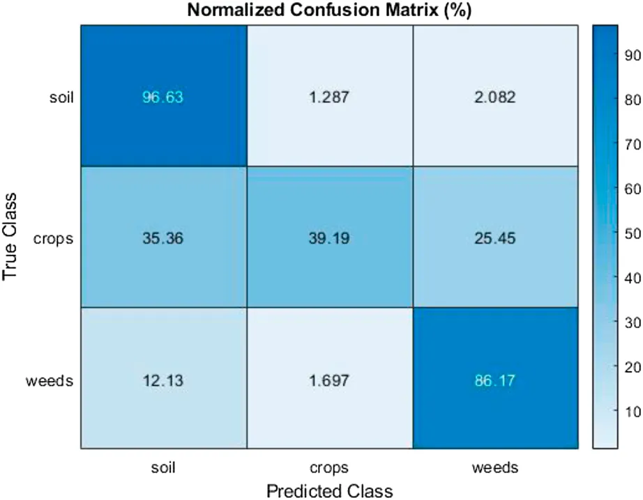 A confusion matrix was used to analyze the performance of the deep learning models for weed/crop classification and the overall accuracy was calculated from the confusion matrix. The accuracy indicates the percentage of correctly identified pixels for each class, while the overall accuracy shows the percentage of correctly identified pixels for all classes. Also, the kappa coefficient (Fleiss et al., 1969) was used in this study to summarize the information provided by the confusion matrix. The Kappa index is a metric that compares an observed accuracy with an expected accuracy or random chance.