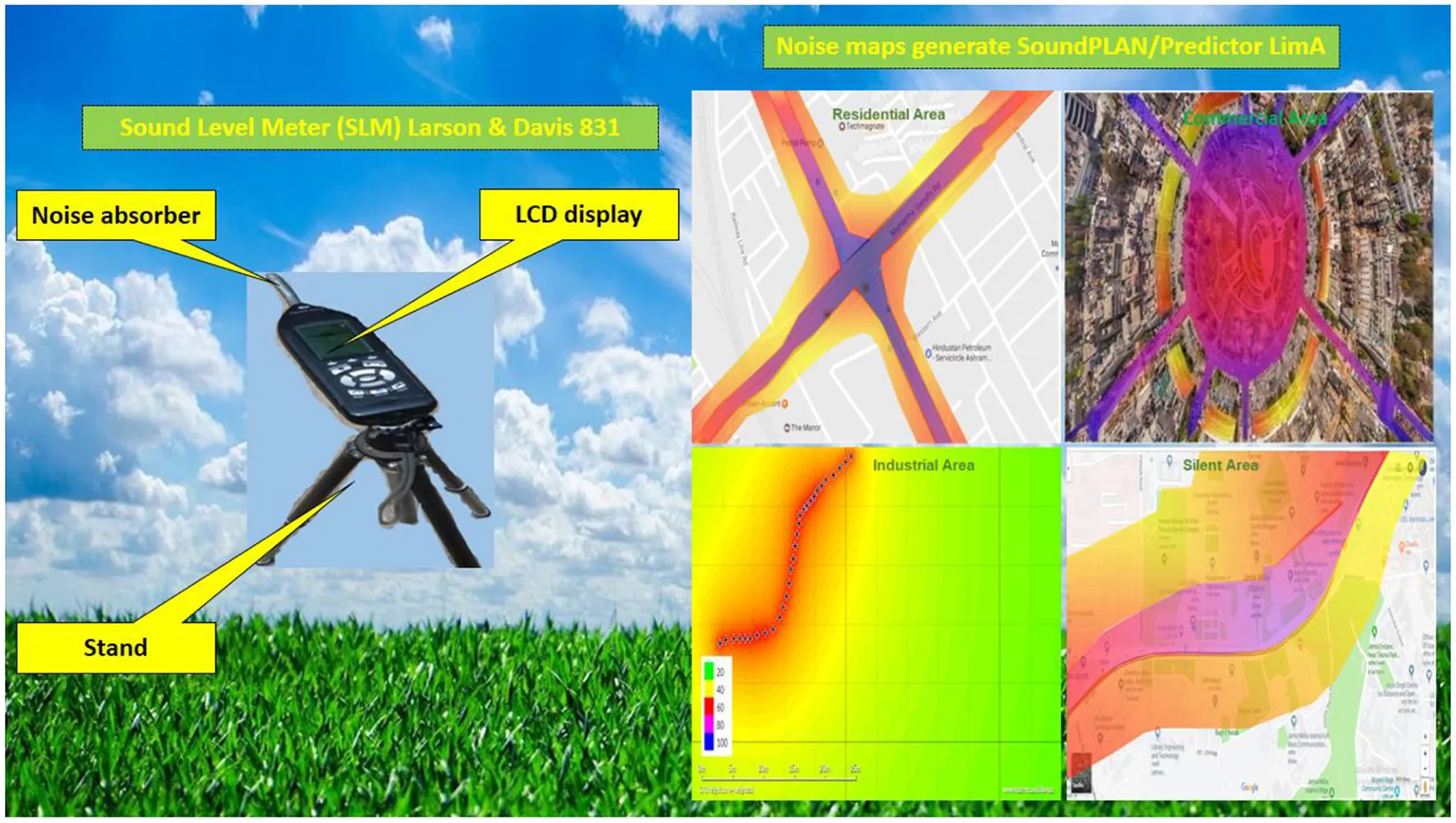 Noise monitoring and 2D noise mapping results pertaining to different (residential, commercial, industrial, and silent) areas is presented and discussed in the succeeding sections.