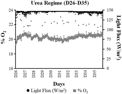 FIGURE 6. Comparison of the average oxygen (% O2) and light flux (W/m2) values obtained during the urea regime of the ground demonstration (Day 26–Day 33). For the graphical representation of data, the values have been reported as the 15-min average of each analyte.