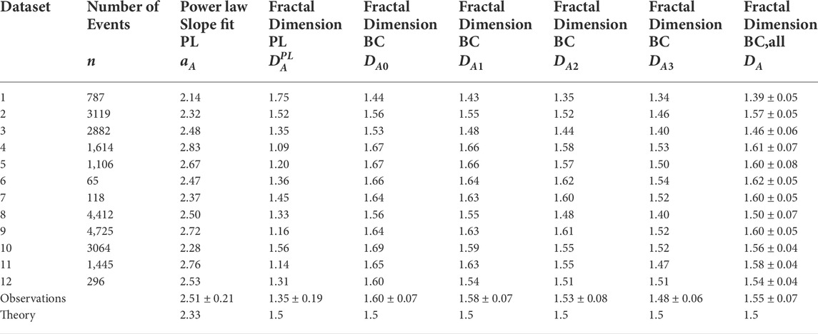 Vice versa we can then obtain the SOC fractal dimension DA from an observed power law slope αA (Table 1), by inverting αA (DA) in Eq. 12,