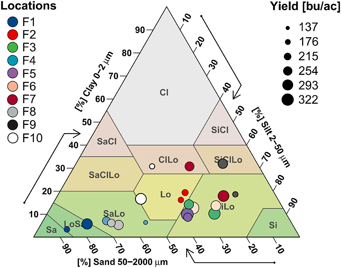 Figure 4. Average soil texture values are mapped onto a USDA Texture Triangle to visualize patterns of soil textural class in relation to farm and yield.