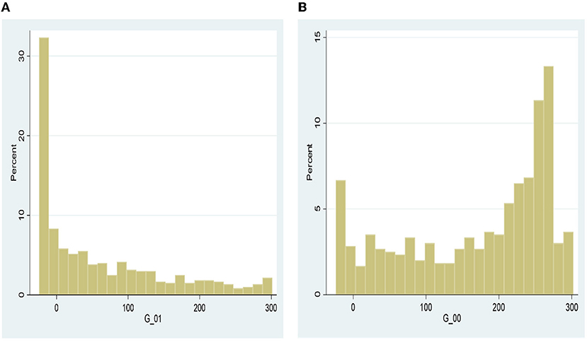 Figure 4. Comparison of yield (Kg/Ha) distributions at the technology frontier—direct effect. (A) Mediated-adopters, (B) non-mediated-non-adopters.