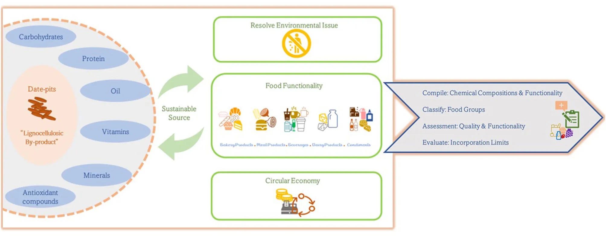 Food functionality is an ever-increasing demand in food manufacturing, and this demand needs to be met in a sustainable manner. Consequently, a great deal of attention should be paid to naturally occurring compounds and their associated bioactive derivatives. However, in some cases, natural resources may be scarce, and alternative by-products can provide for the ever-growing need for food bio-additives (Herrero et al., 2015; Patel et al., 2021). Annual global production of dates was estimated at 7.5 million tons in 2008 (FAOSTAT1). Considering that 10% of this total production consists of the weight of date pits (according to the average percentage estimated; Ghnimi et al., 2017; Essa and Elsebaie, 2022), the annual total amount of date pits accumulated globally is about 750 thousand tons. Moreover, there has been a tremendous expansion in the land area cultivated with date palm trees; thus, total production is expected to grow over time. Unfortunately, date pits are mostly discarded, used as animal feed (Al-Juhaimi et al., 2018), or (in the best cases) used for Arabic coffee (Ranasinghe et al., 2022).