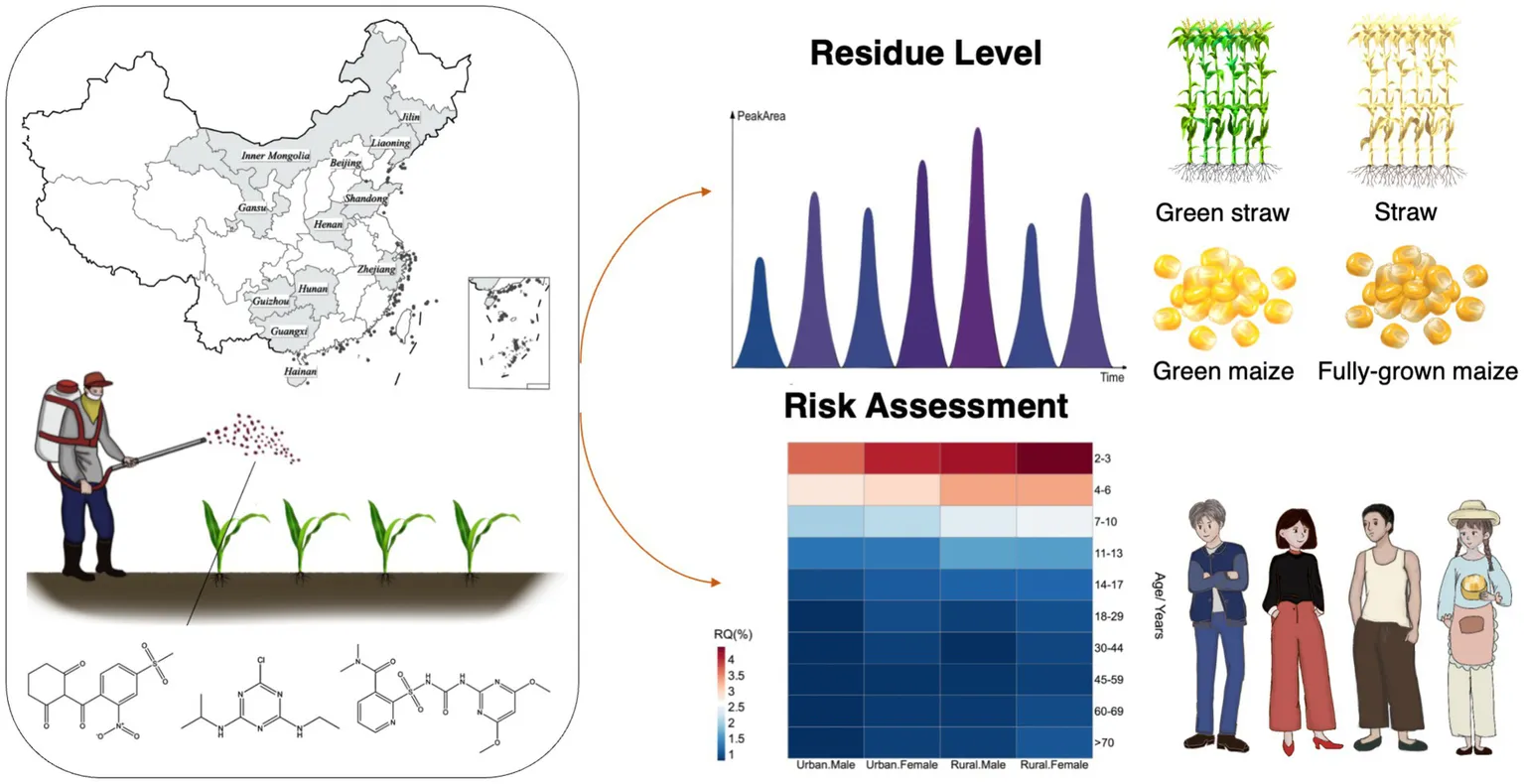To improve maize yield in China, multiple herbicides have been simultaneously applied to control more weeds. However, this combined application raises concerns about potential residues and their subsequent risks to human health. Therefore, evaluating the residues and dietary risk of new herbicide formulations is critical for the sustainability of maize production.