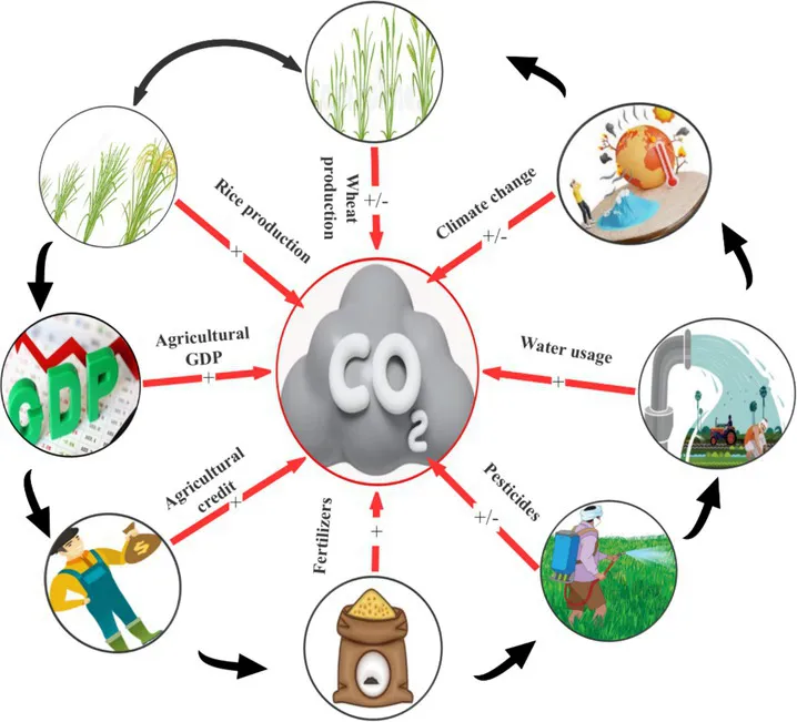 Modern agriculture utilizes advanced agricultural techniques to increase output by extensively using fertilizers, pesticides, water, and financial assistance to farmers. Moreover, these activities have a detrimental effect on climate change and contribute to the rise of carbon emissions in the atmosphere. Figure 2 illustrates a cyclical system of carbon emissions resulting from the farming techniques involved in rice and wheat cultivation. In order to keep up with the increasing need for food, farmers often use excessive amounts of fertilizers, pesticides, and irrigation. The practice is done by adopting advanced agricultural technology, which in turn increases the use of fossil fuels. The manufacture of fertilizers and pesticides itself adds to carbon emissions, since companies require a substantial amount of energy and release carbon dioxide throughout the manufacturing process. In addition, the widespread usage of fertilizers, pesticides, and water, which subsequently evaporates into the atmosphere, greatly contributes to carbon emissions. While this practice may enhance agricultural yield in the short term, it ultimately has detrimental effects on the environment and human health in the long term. These techniques actually decrease soil fertility, lower the water table, and raise production costs, which eventually lead to a rise in carbon emissions and negative effects on the environment, such as climate change, changes in rainfall patterns, severe temperatures, and floods (Ahmad et al., 2024). These unpredictable fluctuations in climate exacerbate the negative impact on agricultural productivity and decrease crop yields. Examining these intricate connections, it can be said that farming practices have broader ramifications for both the sustainability of the environment and the security of food. Gaining a comprehensive understanding of these factors is crucial in developing successful approaches to reduce carbon emissions, improve agricultural output, and guarantee sustainable food availability in the future.